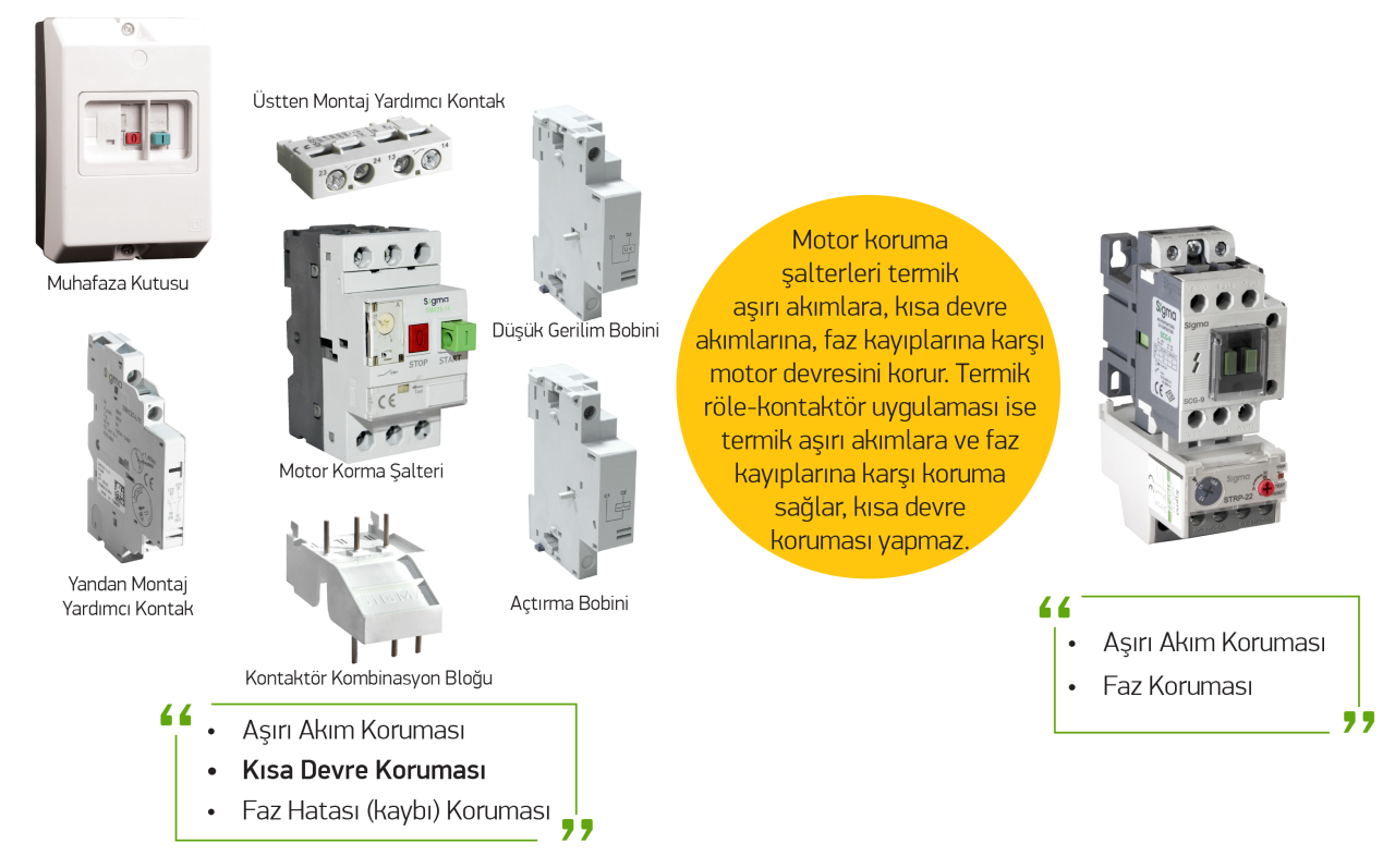 Termik ve manyetik açma salıcıları olan motor koruma şalterleri devre kesici görevi üstlenerek aşırı akım, kısa devre veya faz hatası vb. durumlar ortaya çıktığında motorun korunması için devreye giren bir elemandır. Hızlı davranması çok önemlidir. Otomatik sigorta, otomatik devre kesici gibi elemanlardan farklı olarak motor koruma şalterleri manuel çalıştırılır. Aksesuarlar eklenerek;