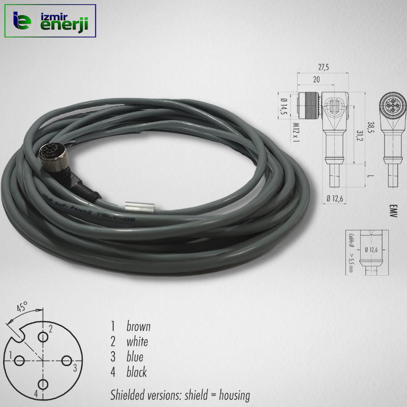 M12 4 Pın 90° 20mt Kablolu Sensör Soketi PVC kılıflı Dişi sensör kablosu. 0.25 mm² kesit ile 60 V çalışma voltajı ve 4 A akım taşıma kapasitesine sahiptir. -25 ile 80 derece sıcaklıklarda çalışabilmektedir. Su geçirmez IP67 koruma sınıfındadır.